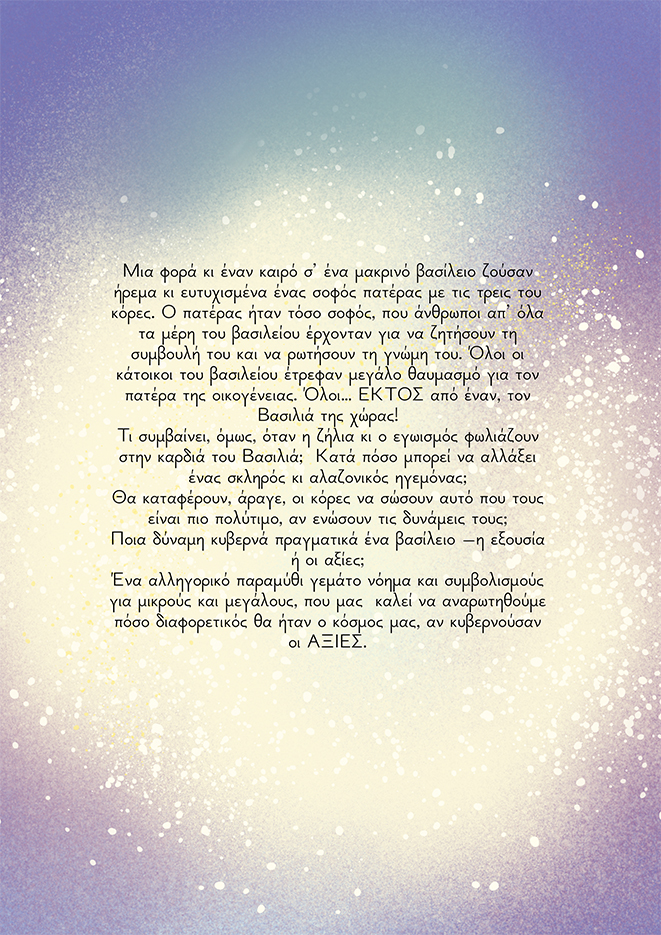 Ένα αλληγορικό παραμύθι γεμάτο νόημα και συμβολισμούς για μικρούς και μεγάλους, που μας καλεί να αναρωτηθούμε πόσο διαφορετικός θα ήταν ο κόσμος μας, αν κυβερνούσαν οι ΑΞΙΕΣ.